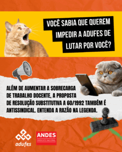 A atuação da diretoria da Adufes está ameaçada pela proposta de resolução substitutiva a 60/1992 pautada para ser analisada, a toque de caixa, no dia 3 de outubro no Conselho de Ensino, Pesquisa e Extensão (Cepe). A atividade sindical não é remunerada e envolve uma série de responsabilidades que vão além da representação formal, o que exige carga horária disponível.