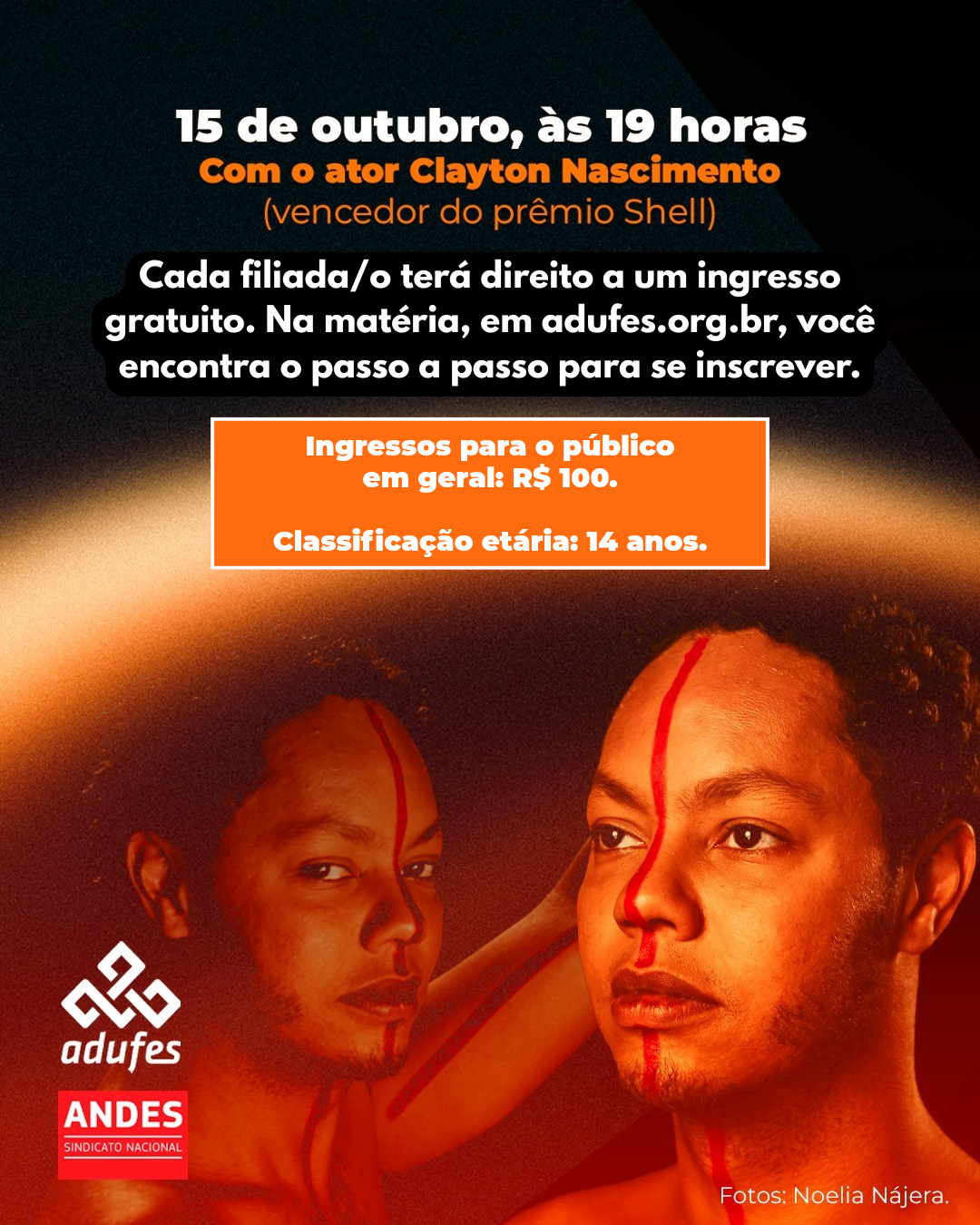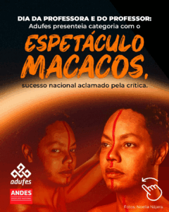 No Dia do Professor, 15 de outubro, a Adufes vai oferecer um presente especial à categoria: o espetáculo Macacos, monólogo com Clayton Nascimento, que também é o criador e diretor do espetáculo. A apresentação será às 19 horas, no Teatro da Ufes, campus de Goiabeiras. Cada docente filiado terá direito a um ingresso gratuito, já disponível na plataforma LeBillet. Para acessar a gratuidade, basta inserir o CPF no campo destinado ao código promocional (com pontos e traços). É necessário apresentar contracheque ou carteira digital da Adufes para comprovar a filiação e acessar o teatro no dia do espetáculo. Para emitir sua carteira digital, clique aqui.