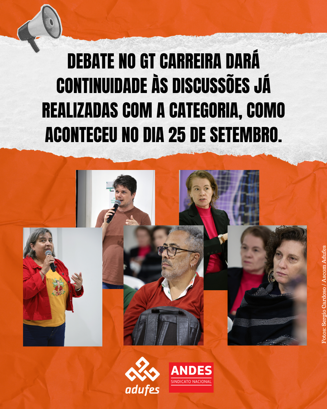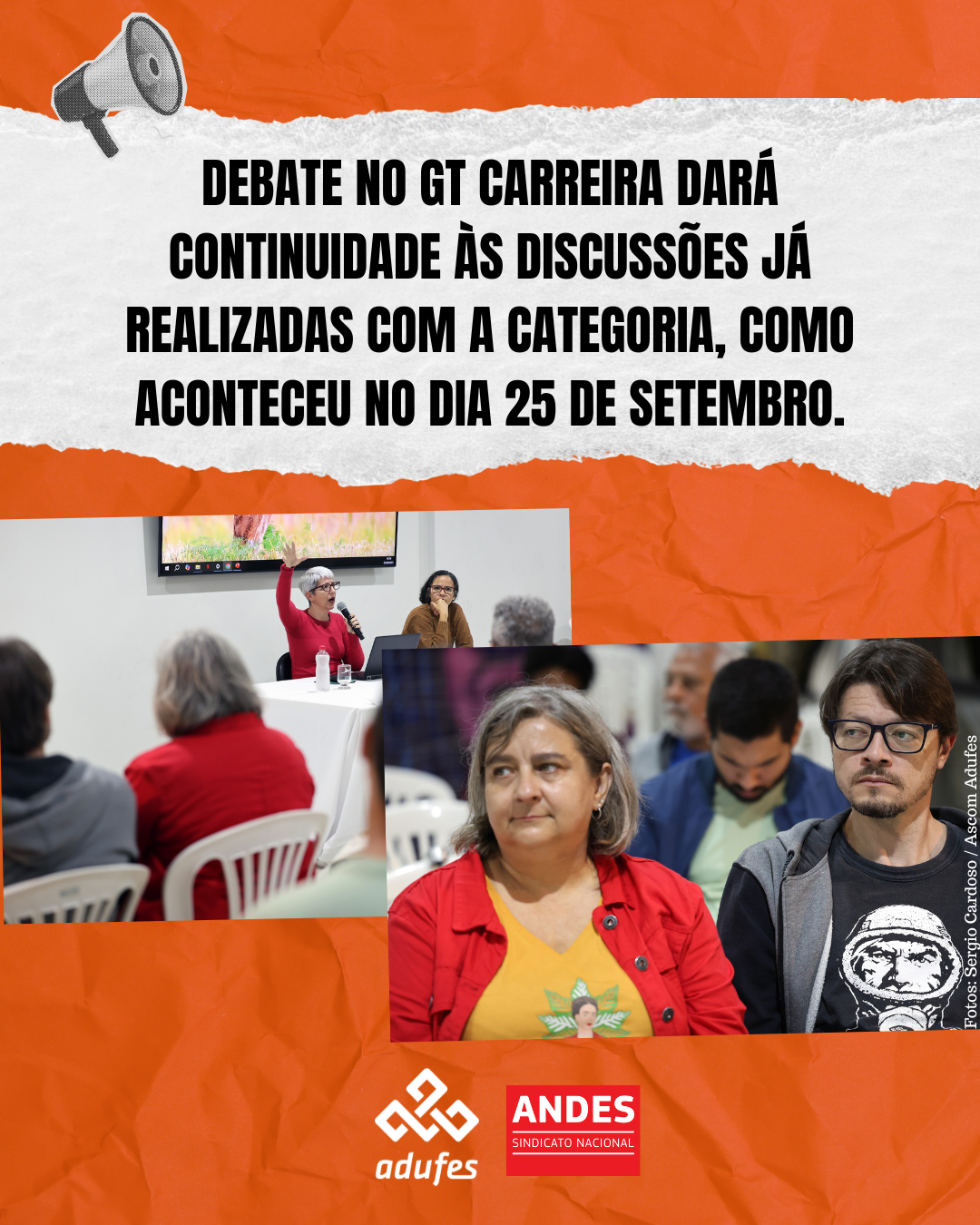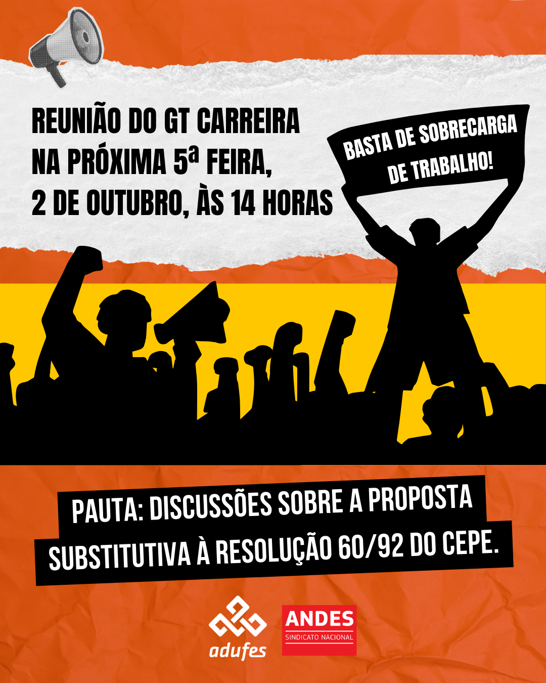 Toda a categoria está convocada para participar da reunião do GT Carreira que será realizada na próxima quinta-feira, 2 de outubro, às 14 horas, na sede da Adufes. A pauta será única: discussões sobre a proposta substitutiva à Resolução 60/92 do Cepe. O debate dará continuidade às conversas que já têm sido feitas. A última delas aconteceu no dia 25 de setembro.