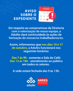 Assim, informamos que nos dias 10 e 17 de outubro, a Adufes funcionará nos seguintes horários: