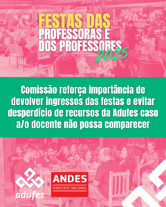 Com a proximidade das Festas das Professoras e dos Professores, a Comissão de Festas da Adufes faz um pedido à categoria para que participe com responsabilidade e atenção aos compromissos assumidos nas inscrições. Só retire convites se for participar e em casos excepcionais em que não puder comparecer, comunique imediatamente a desistência pelo e-mail eventos@adufes.org.br, possibilitando que o convite seja repassado a outro colega e evitando o desperdício de recursos do sindicato.