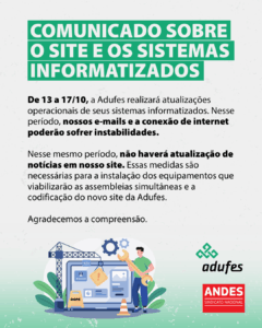 Nesse mesmo período, não haverá atualização de notícias em nosso site. Essas medidas são necessárias para a instalação dos equipamentos que viabilizarão as assembleias simultâneas e a codificação do novo site da Adufes.