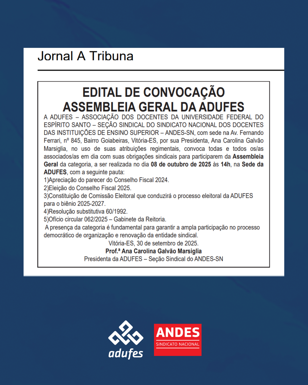 A Adufes convoca todas/os as/os docentes filiadas/os para participarem da Assembleia Geral que será realizada na sede da entidade no dia 8 de outubro, às 14 horas. Entre as pautas estão a constituição da Comissão Eleitoral responsável por conduzir o processo eleitoral da Adufes que definirá a nova Diretoria e Conselho de Representantes para o biênio 2025-2027 e a resolução substitutiva à normativa 60/1992 do Cepe/Ufes, considerada danosa à categoria.