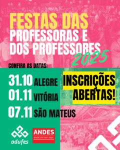 Inscrições abertas para as Festas das Professoras e dos Professores oferecida pela Adufes em Vitória, Alegre e São Mateus