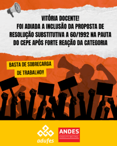 A Adufes realizou uma campanha de comunicação alertando sobre os riscos que a proposta representa e realizou mais de 40 reuniões com docentes nos mais diversos departamentos informando sobre os problemas do texto. A categoria entendeu e exerceu forte pressão que agora resulta nessa vitória parcial que o adiamento da apreciação da matéria no Cepe em pouco tempo de discussão.